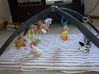 Eh, all good things must come to an end, and since it is costing us $400 a month, it'll be nice to get that $400 added to something else, like our school debt (Thank you Dave Ramsey, again!). She's growing like a weed, and does something new everyday it seems like. Ugh, so cliche. I've become that lady. The "my kid is so advanced and awesome and does new stuff and check her out... blah blah blah" lady. She is figuring out how to play with her toys and loves her play mat (homemade play mat that is, Dave Ramsey wouldn't approve of a separate, unnecessary toy system so we used the play gym bars that came with the pack and play and clipped a bunch of stuff to it).